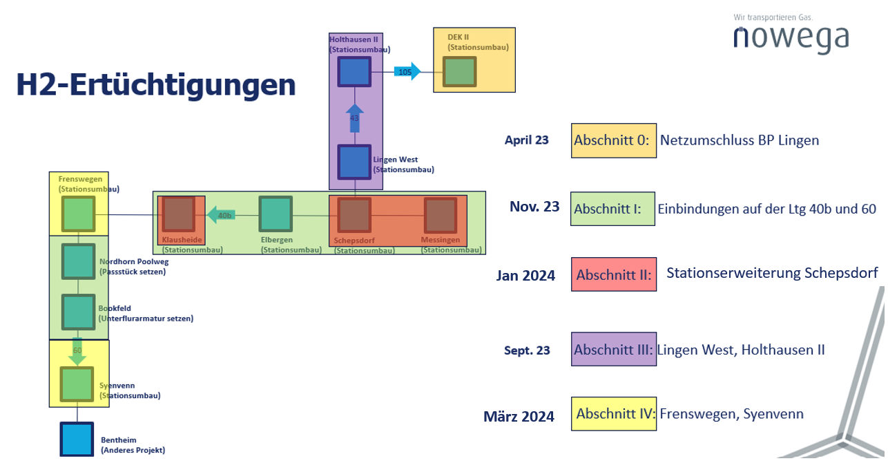 Zur Ermöglichung des Wasserstofftransports im Rahmen des Projektes „Get H2-Nukleus“ wurden bis Ende Q3/2024 Teile des Nowega-Bestandsnetzes auf Wasserstoff umgestellt. Hierzu plante die Nowega den Umbau von insgesamt neun Stationen sowie von insgesamt drei Passstücken.